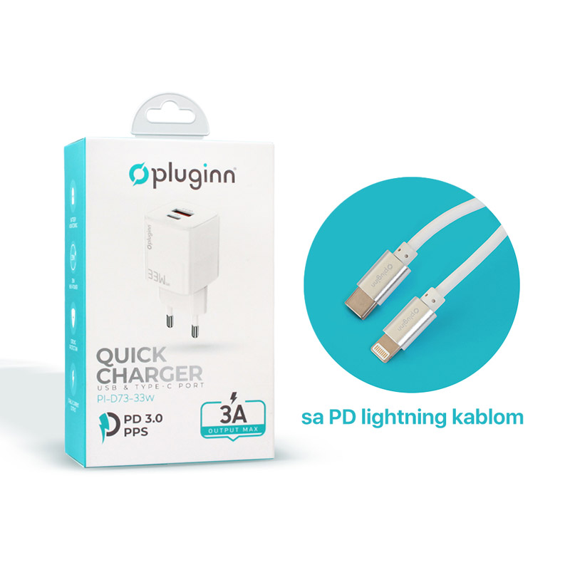 Kucni punjac Pluginn PI-D73, QC3.0 PD3.0, PPS, USB-PD 18W+20W, 38W (total) sa kablom Type-C na iPhone Lightning beli