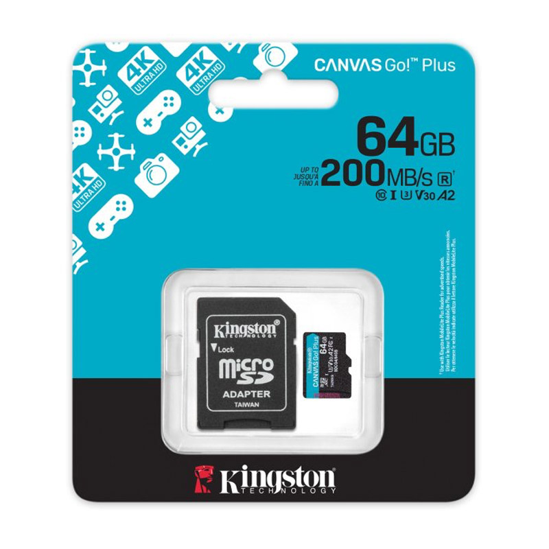 Micro SD kartica Kingston 64GB Canvas GO! Plus Class 10 UHS-I U3 V30 A2 Read up to 200MB/s for 4K and FullHD video recording w/SD adapter